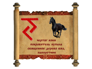 У словенској култури Коњ је сунчани и ватрени симбол, који је повезан са породичним благостањем и плодношћу земље. Представници овог чертога су под окриљем словенског бога Купала, који персонификује вечну младост, и способни су да очисте сва три људска сушатаства (душу, тело и дух) од разних тегоба и тамне енергије, која се накупља током живота.